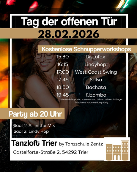 Am Samstag, den 28.02.2026, öffnen wir im Tanzloft Trier unsere Türen für Euch und laden Euch herzlich zu einem Tag voller Workshops und gemeinsamen Tanzens ein 🎉