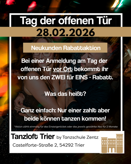 Und das beste - bei einer Anmeldung am Tag der offenen Tür vor Ort bekommt ihr den 2 für 1 Rabatt -> Zwei tanzen, einer zahlt!